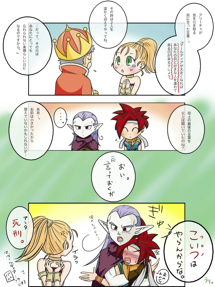 クロノと魔王とマール親子で虹色の貝殻騒動。